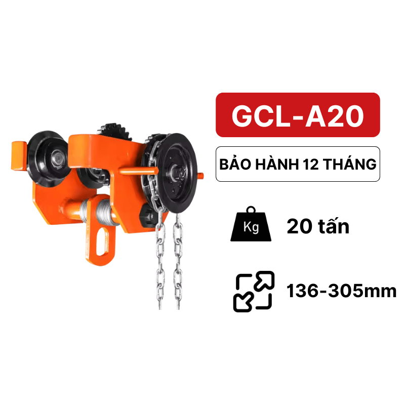 Con chạy xích kéo tay 20 tấn là một thiết bị di chuyển bằng tay giúp nâng hạ hàng hóa trên hệ thống dầm chữ I hoặc H. Khẩu độ mở dao động từ 136mm – 305mm kết hợp với xích kéo dài 3m. Con chạy thường được kết hợp với pa lăng xích kéo tay hoặc pa lăng xích điện. Hàng chính hãng Kawasaki có đầy đủ CO, CQ về nguồn gốc xuất xứ và chứng chỉ xuất xưởng.