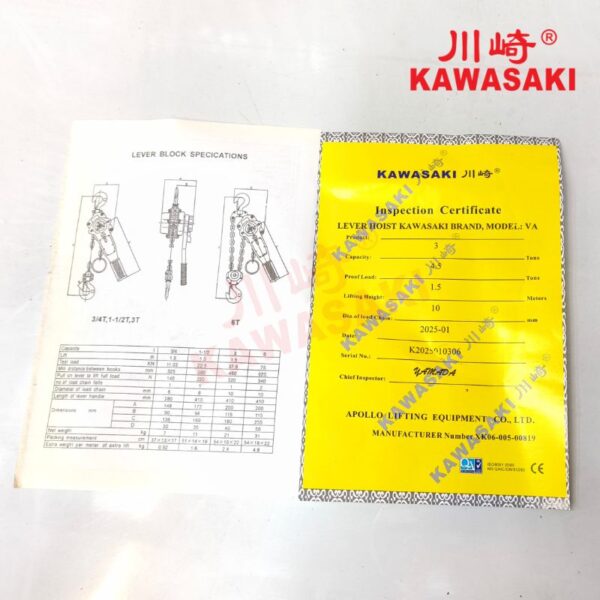 Pa lăng xích lắc tay Kawasaki hoàn toàn đáp ứng được yêu cầu với các dự án cần thiết bị có giấy tờ kiểm định. Bởi vì, tất cả sản phẩm pa lăng xích lắc tay Kawasaki đều được nhập khẩu trực tiếp từ nhà máy qua đường chính ngạch. Đi kèm đầy đủ chứng từ CO, CQ về nguồn gốc xuất xứ và chứng chỉ xuất xưởng.